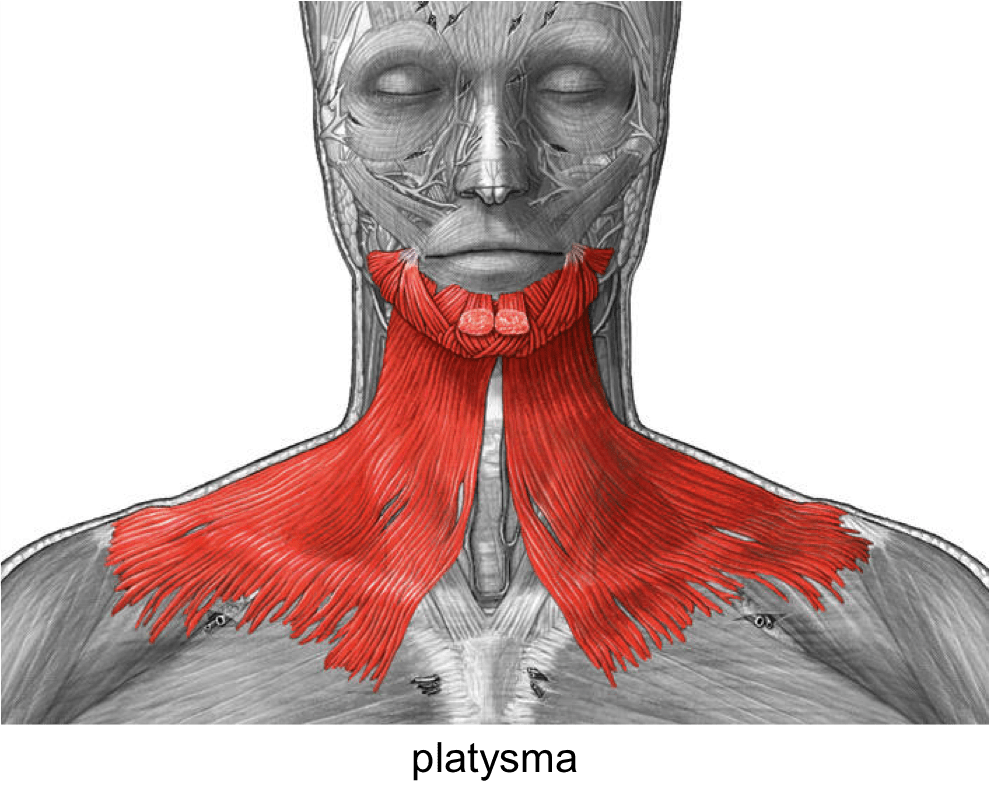 The platysma muscle is a long, sheet-like muscle that originates from the clavicle and extends to around the mandible. This muscle also fuses with the DAO muscle aka the muscle responsible for the “downwards turn” of our mouth. The result of these muscles being hyperactive contributes to jowling, an increased show of vertical neck bands (when you strain or say “eeee” you may see these), a downwards pull of the sides of the mouth, less jawline contour, and an overall heaviness in the lower face.