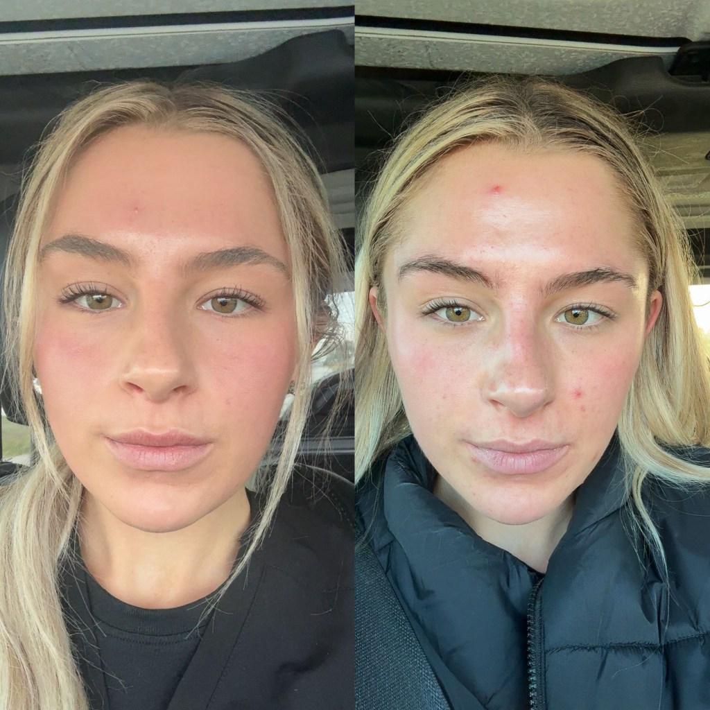 Just to show you how close your gut/diet and your skin is, these photos were taken 3 days apart! One on Friday morning, and one on Monday morning! I am very strict and regimented with what I eat on a day-to-day basis; however, this weekend I was traveling and indulging in wine and dairy! It is crazy to see how quickly these choices manifest on our skin!