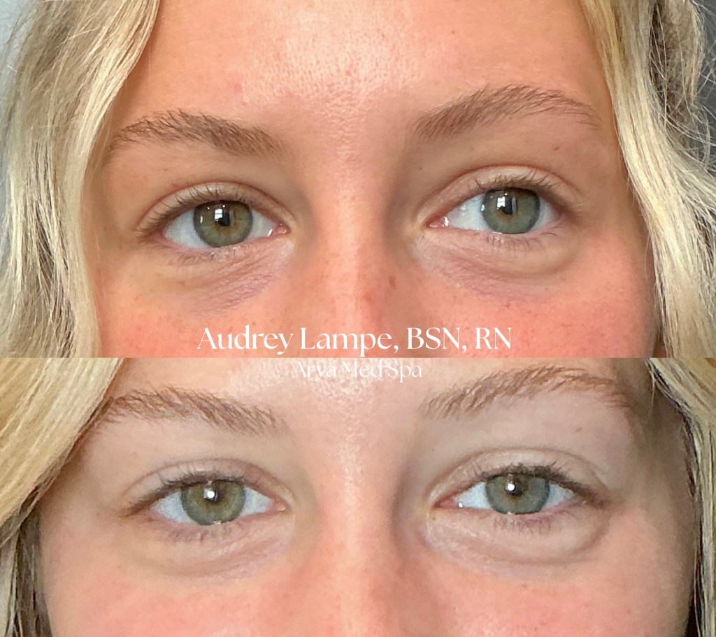 How does this work? We start by drawing your blood, similarly to what you would have done for routine lab work. Then, we will take the blood sample and spin it in our centrifuge; the centrifuge will separate the heavy red and white blood cells at the bottom of the vial from the “liquid gold” aka the platelet rich plasma that rises to the top of the vial. The “liquid gold” is packed with platelets and growth factors that stimulate collagen production, increase circulation, and repair tissue at a cellular level. When the concentrated plasma is injected back into the undereye area, it jumpstarts your skin’s natural healing and regeneration process — improving tone, texture, and elasticity from within. Because this treatment option is regenerative, it will take a series of treatments for the best outcome (3 treatments spaced 4-6 weeks apart). Your most optimal results will be 4-6 weeks after your final treatment (as seen above).